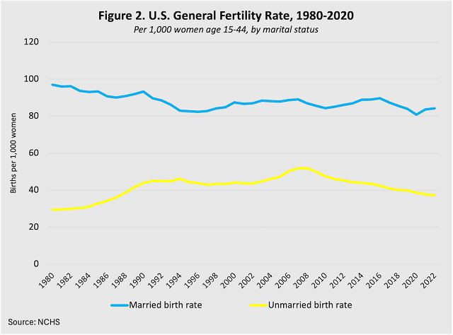 Birthrates for married couples have actually been mostly stable since the 1990s. (Save for a modest decrease from 2016-2020).