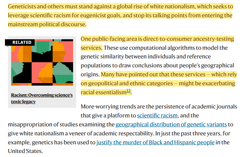 A new commentary piece in Nature today frets over the rise of eugenics and white supremacy, especially in the field of genetics.