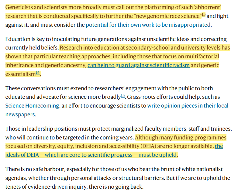 The only fix if we can’t tackle their ideas with science? Call out “abhorrent” research and deplatform them. The “new genomic race science” stops dead. Also, teach kids it’s all junk racist science — nothing to see here, folks. And keep pushing DEI.
