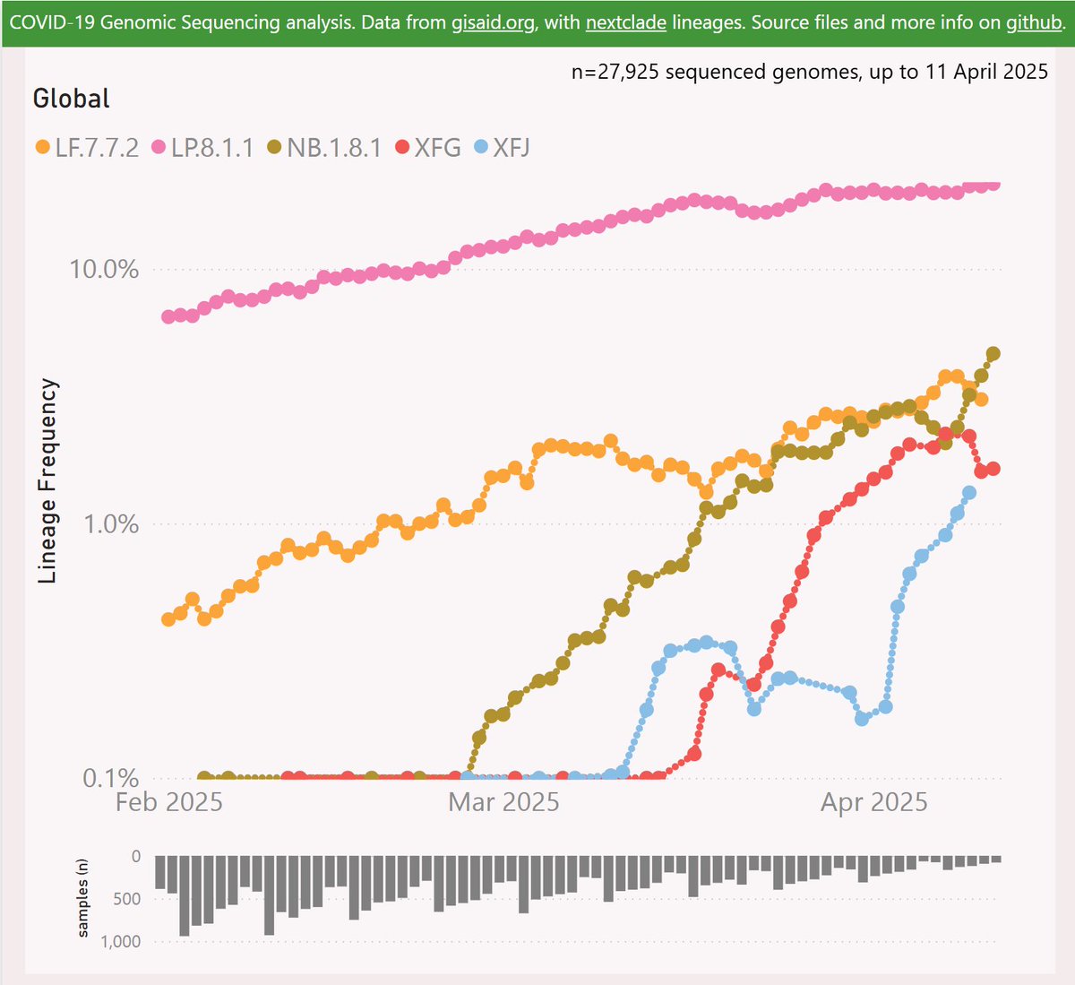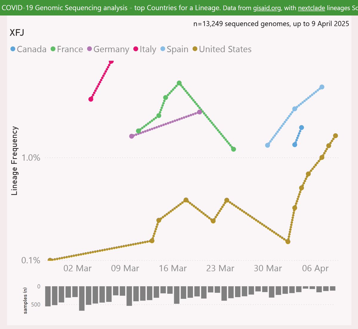 I will stick with NB.1.8.1 as the leading contender. It is showing growth in multiple countries. XFJ is chasing hard, with quite strong growth in early April.