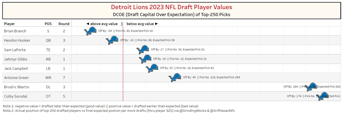 by assigning draft capital via consensus 1st round mocks an consensus big boards to each draft pick pick, we can compare the total draft capital used to draft a player at a particular point in the draft relative to what was expected