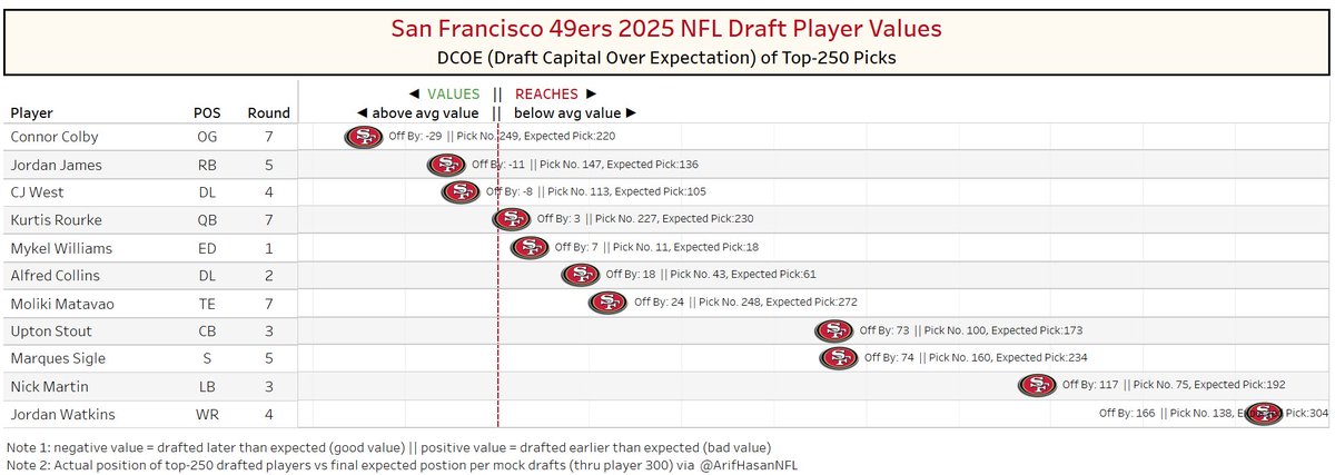 their biggest reach was Hayden Conner in the sixth round, but reaching for a player in the sixth round is certainly not a problem, and they finished #3 overall in 2025 draft value