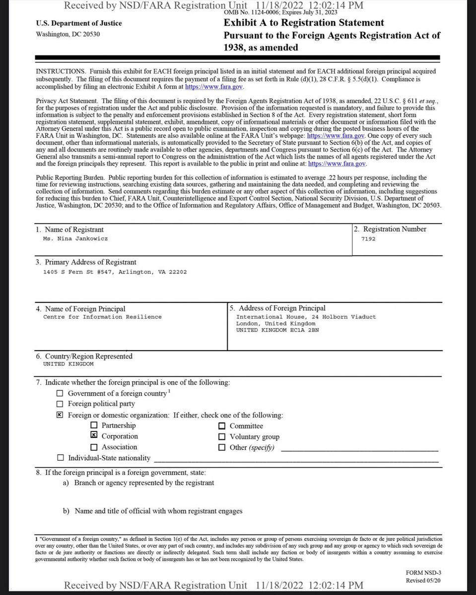 She registered under FARA (Foreign Agents Registration Act) to work for the Centre for Information Resilience (CIR) — a UK-based group funded by the British Foreign Office.
