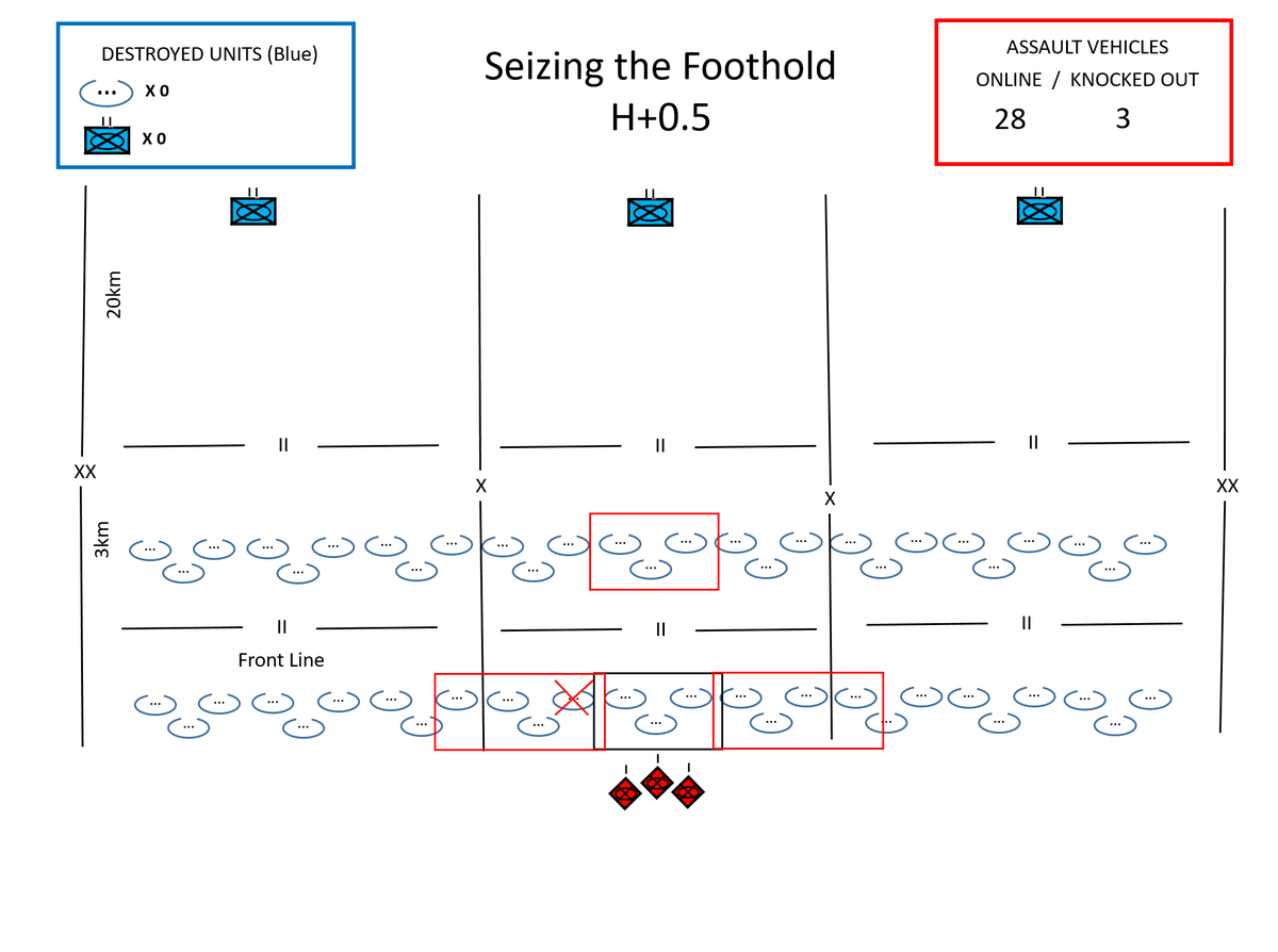 Here we see the initial battlefield set. Of note, I'm depicting the Russians tactically by company but will be keeping a more precise tally of assault vehicles destroyed. Russian company icons will be removed as appropriate.