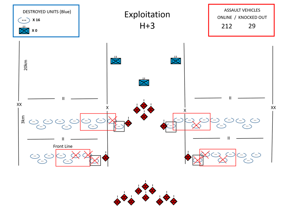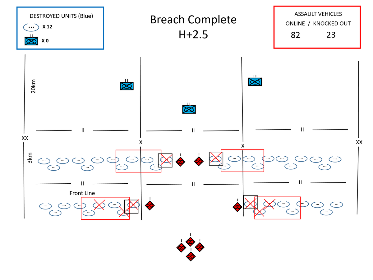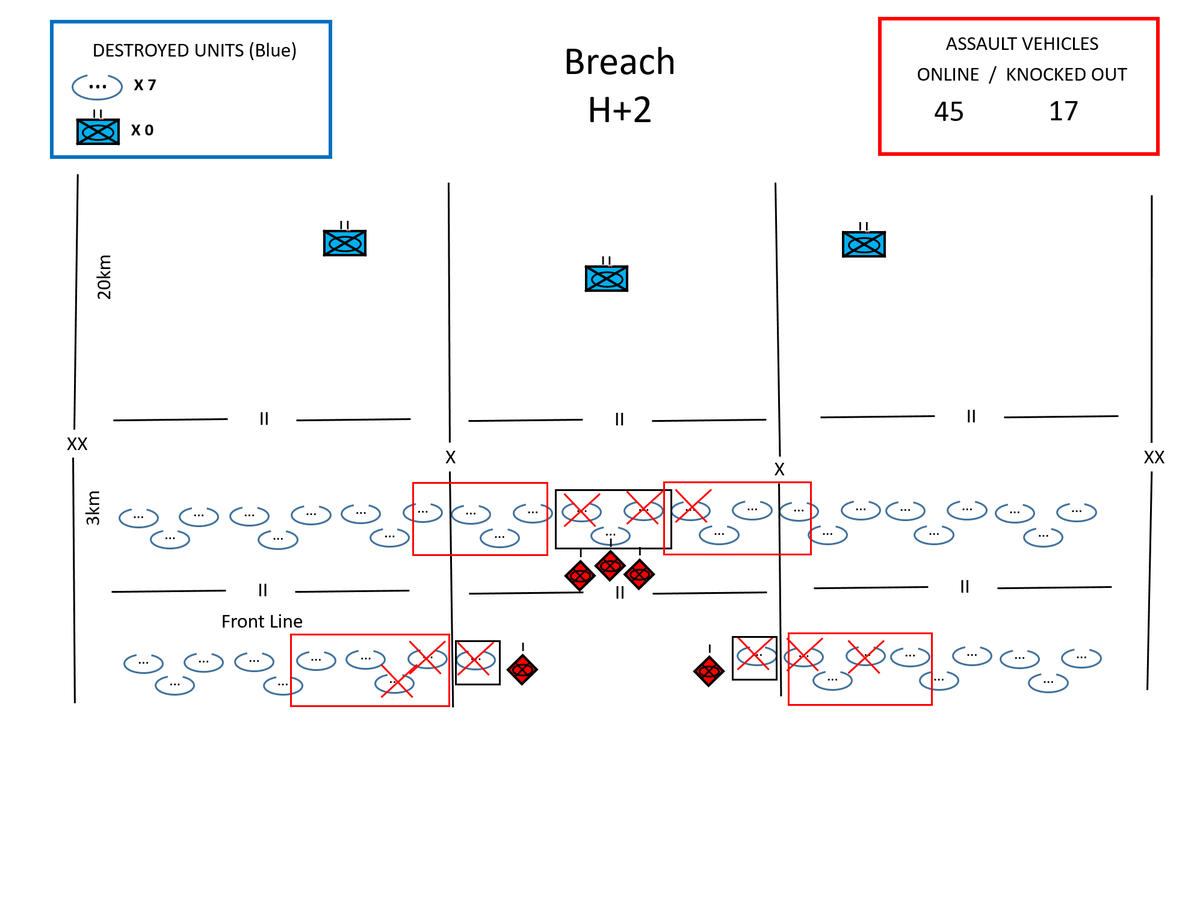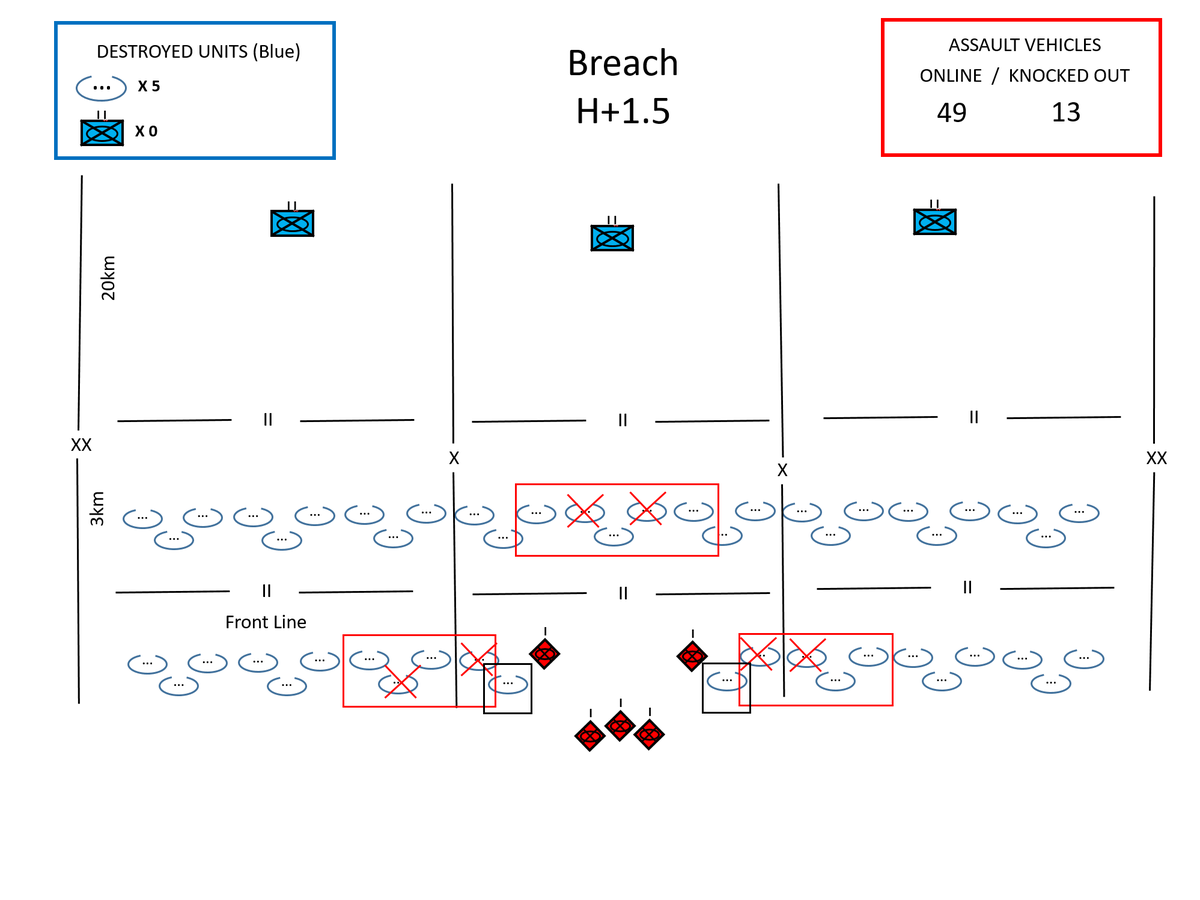 Under a hail of drones, the second wave plows over the central strongpoints and into open country, trading fire with the lead elements of the local reserve.