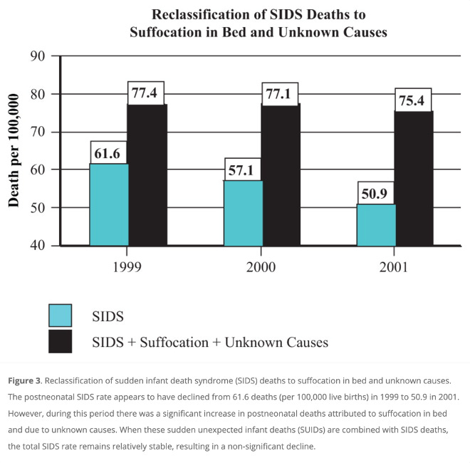 (16/19) In the early 2000s, SIDS rates fell—but infant deaths hardly did. Labels just changed. 90% of the SIDS decline from 1999–2001 was due to reclassification as “unknown causes” and “suffocation,” not real progress.