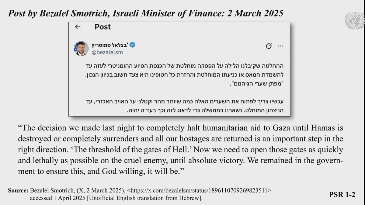 Reichler begins by quoting Smotrich and @Israel_katz, both of whom have made crystal clear that the goal Israel's total siege—now in its second month—is to directly target Gaza's civilian population for destruction and starvation.