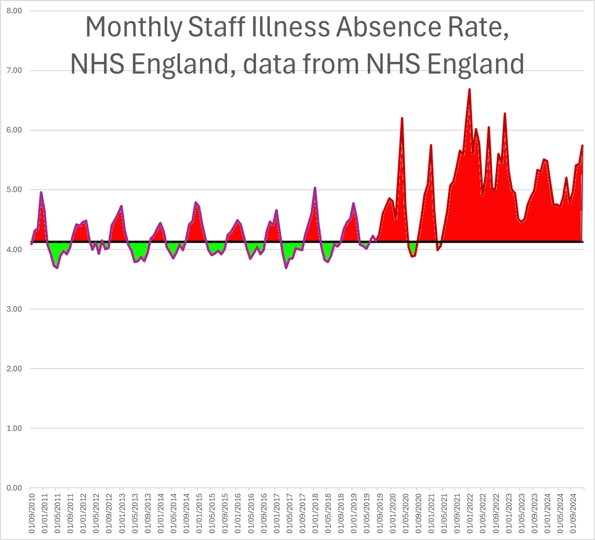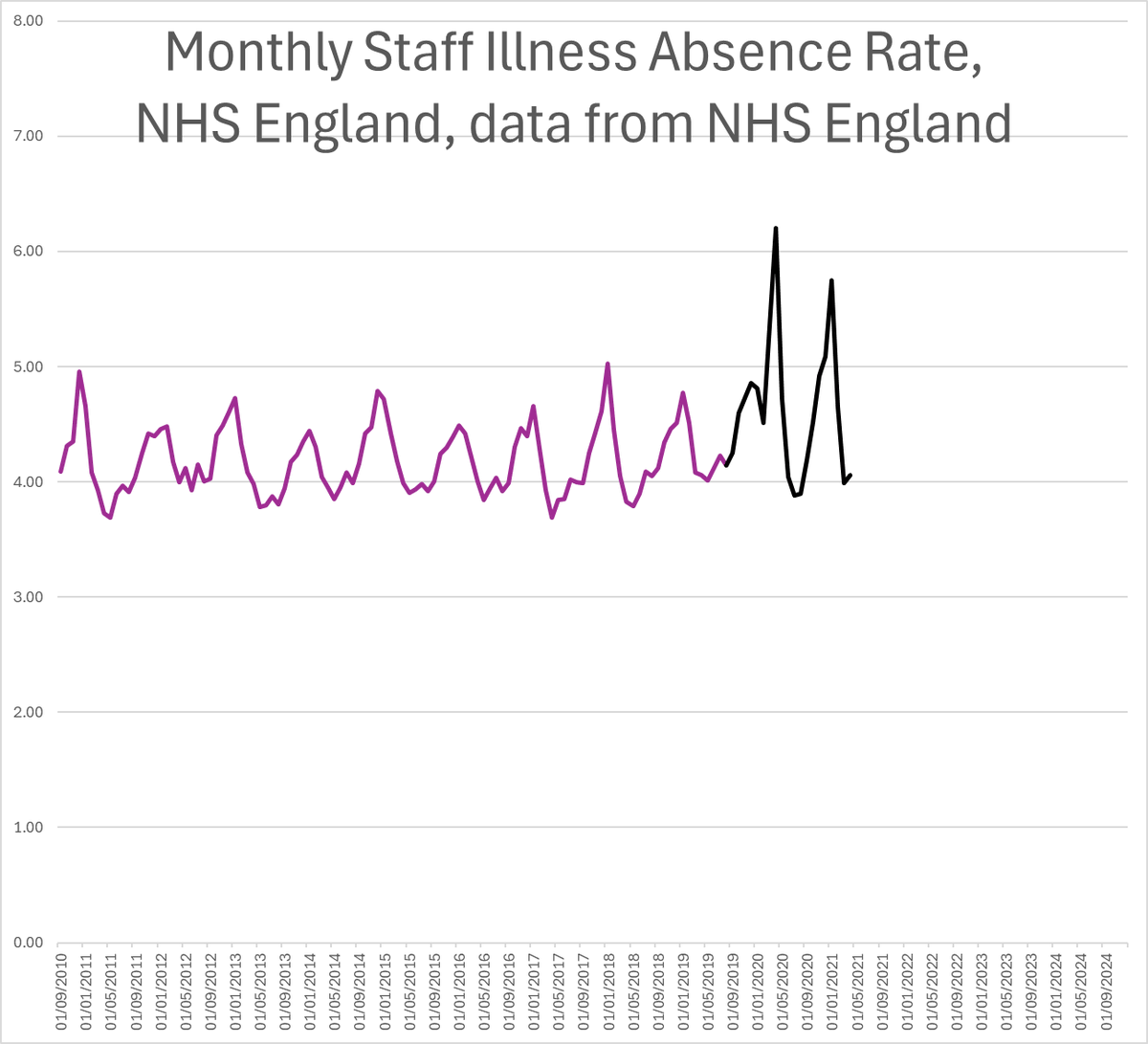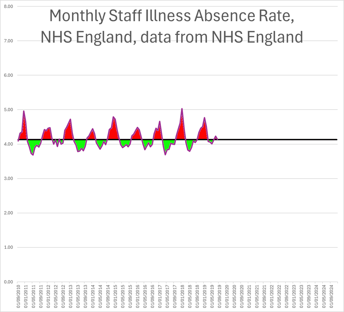 If we put pre-pandemic average of 4.13% on there you can easily see the winter peaks of absence, and the improvements in the summer.