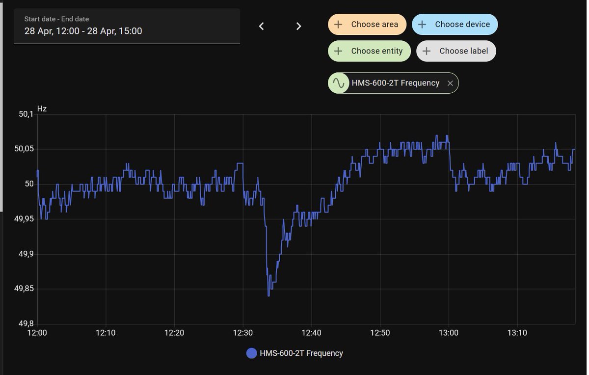 Zanimivo, desinhronizacija z ostalo Evropo je bila šele ob 12:38, torej po tistem množičnem razpadu, ki smo ga videli v prvem tvitu in po padcu frekvence (enak čas je tudi na gridradarju, neodvisno od moje elektrarne). Verjetno je bil pol import preobremenjen in je zato padel. 🤔