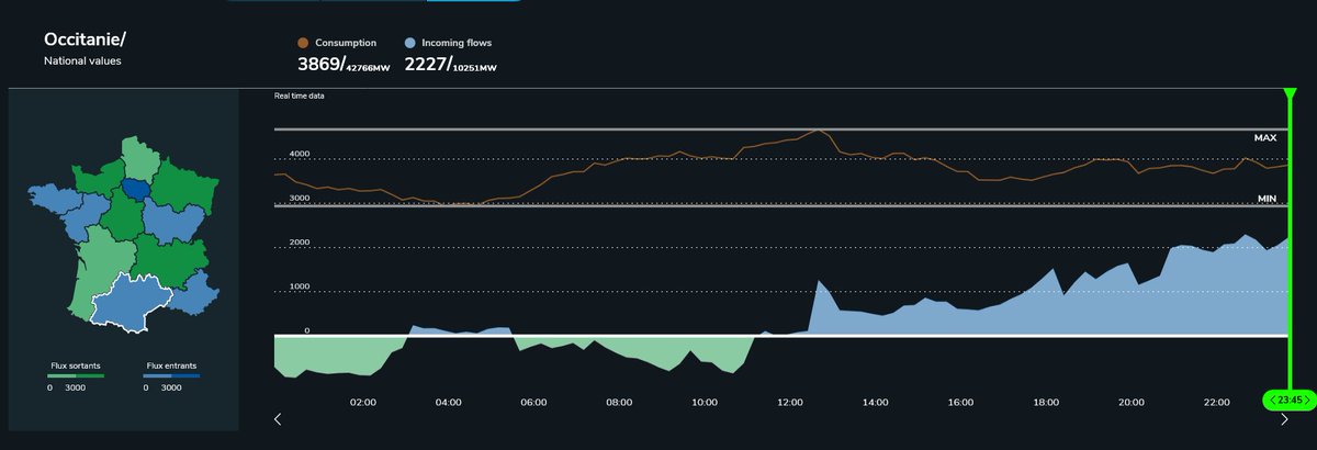Pretok pa je zanimiv. Zahod Pirenejev je bil nonstop, da je Francija izvažala, vzhod pa je okoli 12 imel ~0 pretoka, okoli 12:30 pa naglo narastel uvoz Francije.