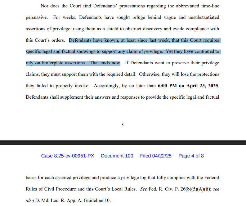 Judge Xinis UNLOADS on DOJ, saying that their time of offering only "boilerplate assertions" to justify claims of privilege "ends now."