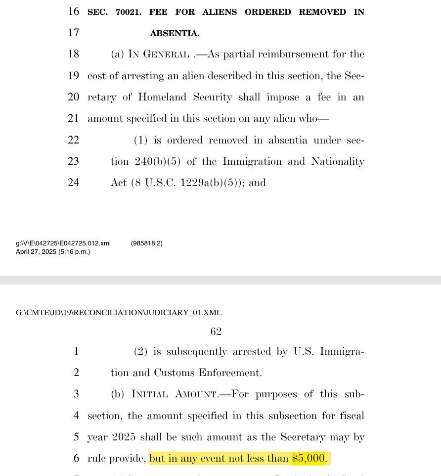 - $5,000 "fee" for being ordered deported for missing a court hearing.