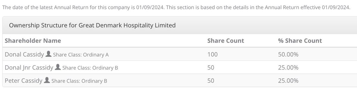 Cassidy and his two sons own 100% of Great Denmark Hospitality Limited