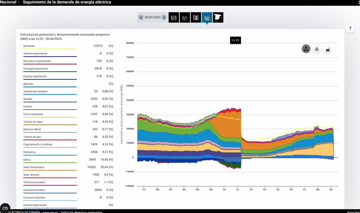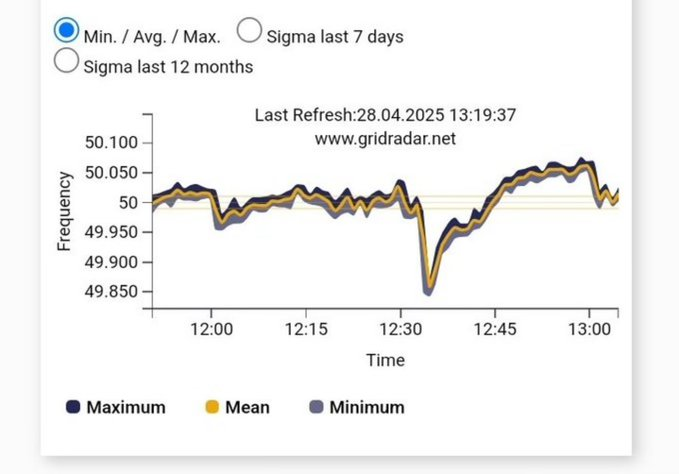 Velik špajnski izvoz potrjuje spodnji graf, ki prikazuje, da je po 'izklopu' Španije, frekvenca v preostanku EU padla močno padla, nakar se je omrežje stabiliziralo (btw. bili smo precej blizu razpada omrežja tudi drugje po EU). 3/n