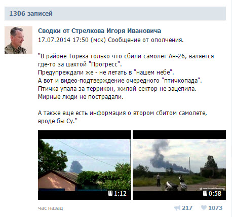 Chvíli po zmizení letu separatisté na sociálních sítích oznamují, že právě zničili ukrajinský vojenský letoun. Přidávají fotky kouře, chlubí se.🙌