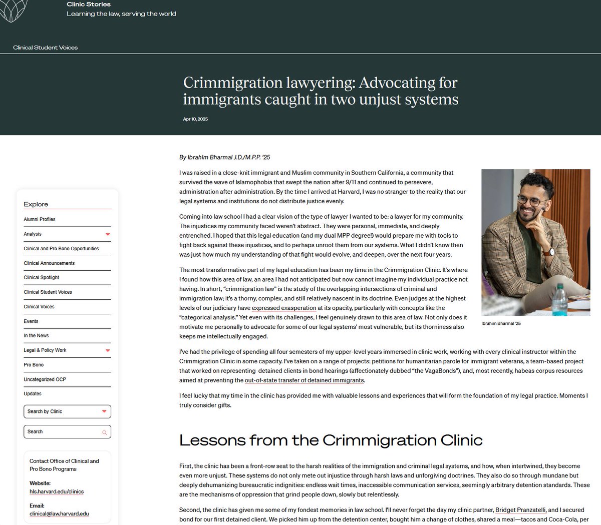 Profile of Ibrahim Bharmal featured on the website of Harvard Law School's Office of Clinical and Pro Bono Programs, published April 10, 2025: hls.harvard.edu/clinic-stories…