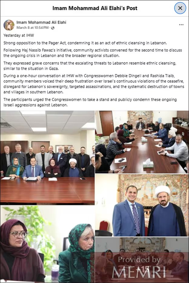 On March 7, 2025, Rep. Debbie Dingell (D-MI), Chair of the House Democratic Policy and Communications Committee, met Imam Mohammad Ali Elahi at his Islamic House of Wisdom in Dearborn, MI, alongside Rep. Rashida Tlaib.