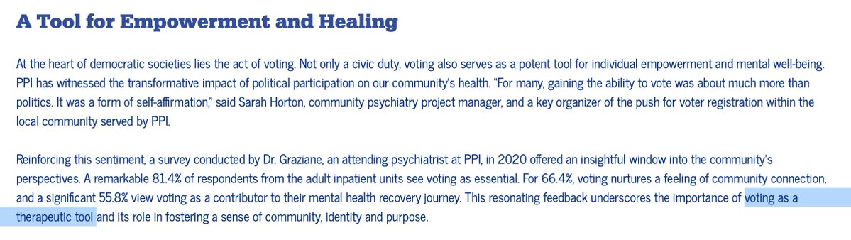 The Pennsylvania Psychiatric Institute, an inpatient facility for people with psychotic disorders, used Vot-ER’s tools to register patients to vote, citing the “therapeutic” benefits of civic participation.