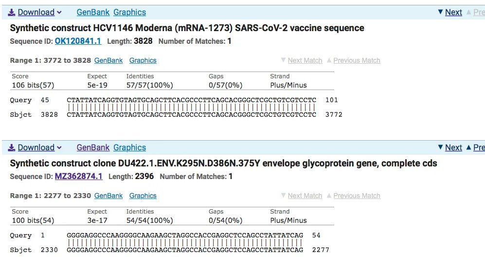 In addition to this plasmid DNA sequence, we can see sequences that map to a Moderna patent for an HIV vaccine in development.