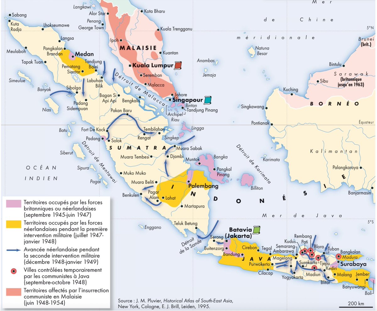 Les vieilles puissances européennes réagissent par d’inutiles guerres coloniales. Royaume-Uni, France et Pays-Bas tentent en vain de sauver leur empire en envoyant des troupes expéditionnaires, parfois en s’obstinant des années par des massacres absurdes (ici Indonésie-Malaisie).