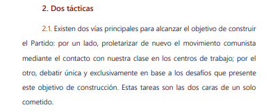 En él arrancamos de una premisa coyuntural fundamental: el Partido Comunista no existe. Por lo tanto, no hallamos en una etapa prepartidaria en la que su construcción es el objetivo de todos los revolucionarios.