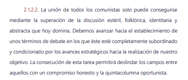 Sin embargo, este proceso solo puede prosperar si, en paralelo, los comunistas nos desprendemos de las adhesiones folklóricas y del «espíritu de siglas» y volvemos a supeditar los debates a las exigencias estratégicas que imponga el avance hacia nuestro objetivo.