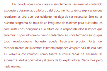 No quisiéramos terminar sin un apunte decisivo. No pretendemos que este Programa sea nuestro, al contrario. Si lo hemos formulado en unos términos parcialmente abstractos es para que todo comunista honesto se lo pueda apropiar y/o discutir.