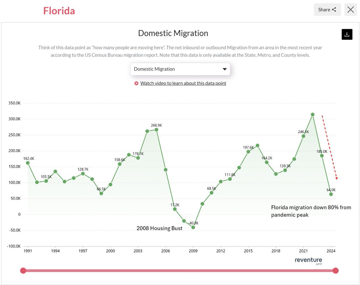 And when Florida goes through reduced migration, major problems crop up in the housing market. Because prices went up based on the influx of people previously moving in.