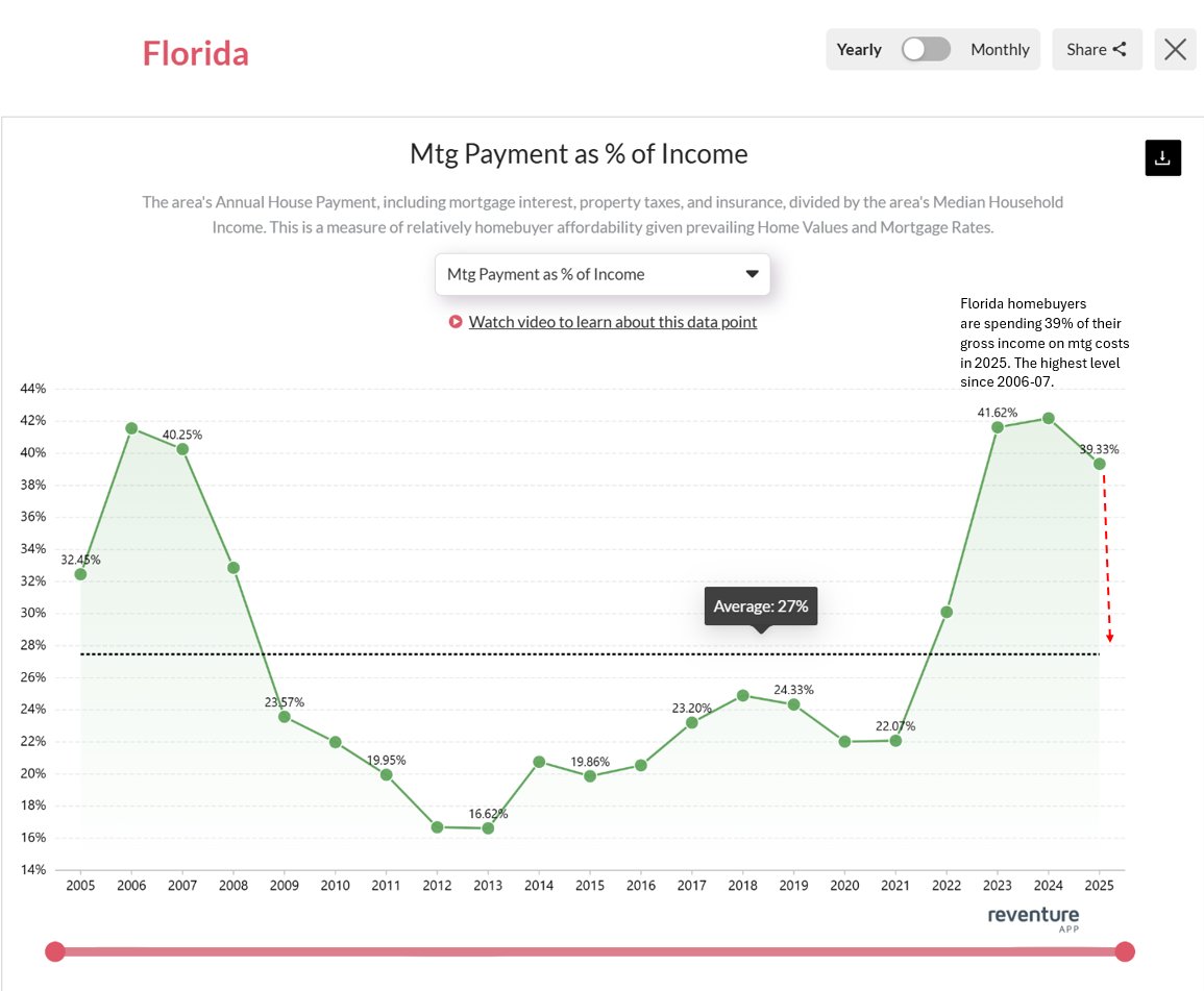 9) Data on Reventure App shows that local homebuyers in Florida now need to pay 39% of their gross income on the mortgage and tax costs for buying a house.