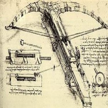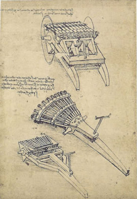 The irony? He hated war. He just wanted to protect people from it. is a giant crossbow. When he designed this war machine it was entirely for intimidation. He knew that the fear weapons could put in enemies was almost if not as important as how much damage that they could actually do. The bow would be 27 yards across and made of thin wood for flexibility. The device would be rolled on six wheels, three on each side, for mobility.  Photo credit: nhddavinci synthasite