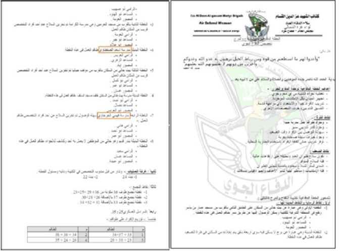 A 2014 document titled "The Defense Plan of the Al-Tuffah and Al-Daraj Battalion" shows emergency positions and personnel assigned to each. @UNRWA schools Asaad Al-Zaftawi and Fahmi Al-Jarjaou are on the list. The presence of an arms depot adjacent to one of them is noted.