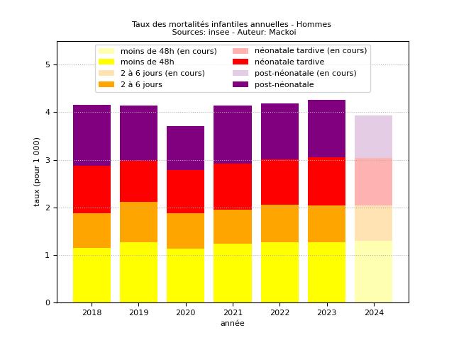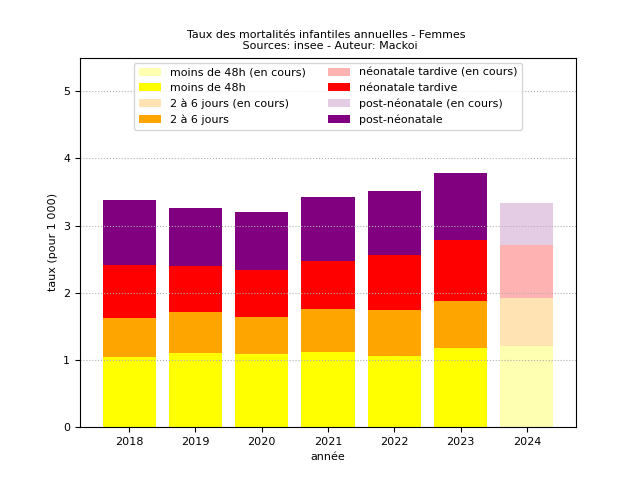 Pour les bébés nés en 2024, les mortalités infantiles continuent leur progression. Depuis 2018, pour les mortalités à moins d'un mois, si ce ne sont les bébés nés en 2024 qui ont les mortalités les plus élevées, ce sont les bébés nés en 2023.