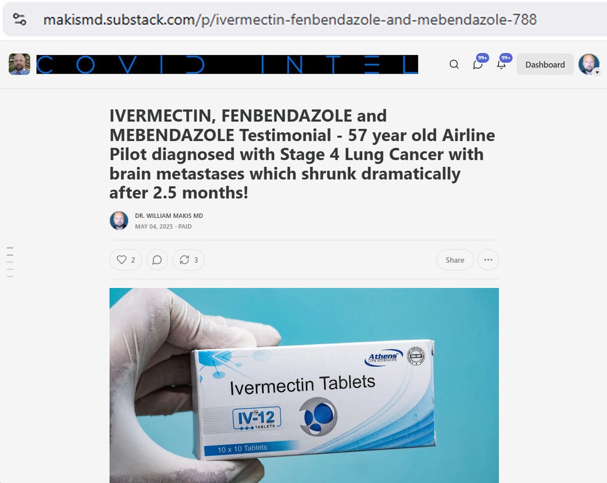 NEW ARTICLE: IVERMECTIN, FENBENDAZOLE and MEBENDAZOLE Testimonial - 57 year old Airline Pilot diagnosed with Stage 4 Lung Cancer with brain metastases which shrunk dramatically after 2.5 months!