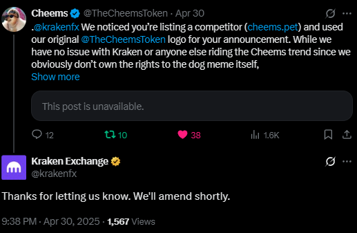 @krakenfx @TheCheemsToken @krakenpro When Kraken used $Cheems logo for their CheemsPet rollout, they quickly deleted the post, promising to "Amend shortly" which we are still awaiting.