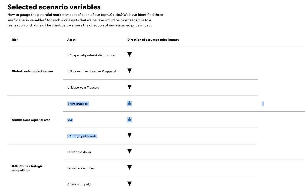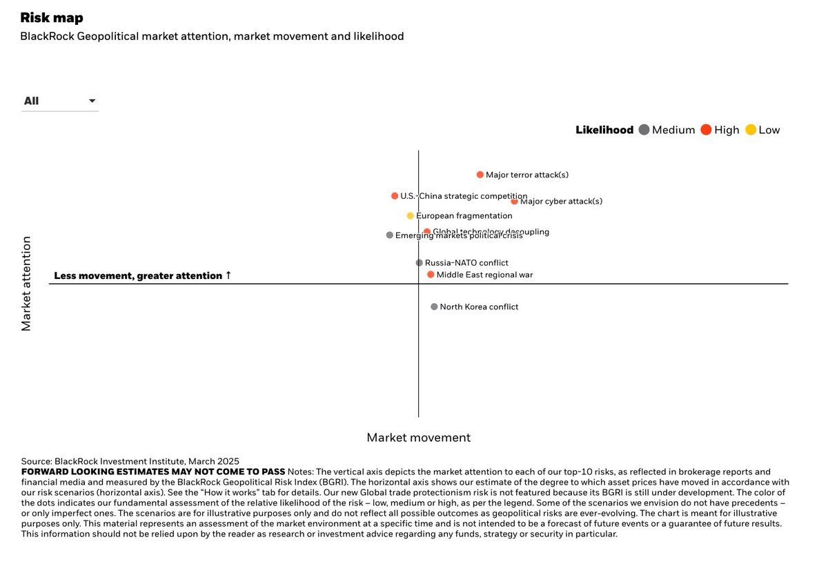 پیوست ۳. متاسفانه اطلاعات اخیر بلک راک از بازارهای مالی جهان نشان میدهد که به رغم آنکه این بازارها احتمال جنگ فراگیر در خاورمیانه را بالا میدانند، و طبق محاسبات و مدلسازیهای بلک راک اثر آن در ایجاد تحریک در بازارهای مالی جهان (در ماه آوریل) قابل توجه است، اما در میان ۱۰ عامل موثر بر بازارهای مالی «دارای کمترین توان از حیث جلب توجه بازارهای مالی است» و این امر نه تنها ذاتا مایه نگرانی بسیار است، بلکه این گرانی مضاعف میشود که وضعیت این پارامتر را با وضعیت آن در ماه مارس مقایسه کنیم. به عبارتی بازارهای مالی آمریکا آثار جنگ فراگیر در خاورمیانه را بر سرنوشت خود جدی تلقی نمیکند./۴