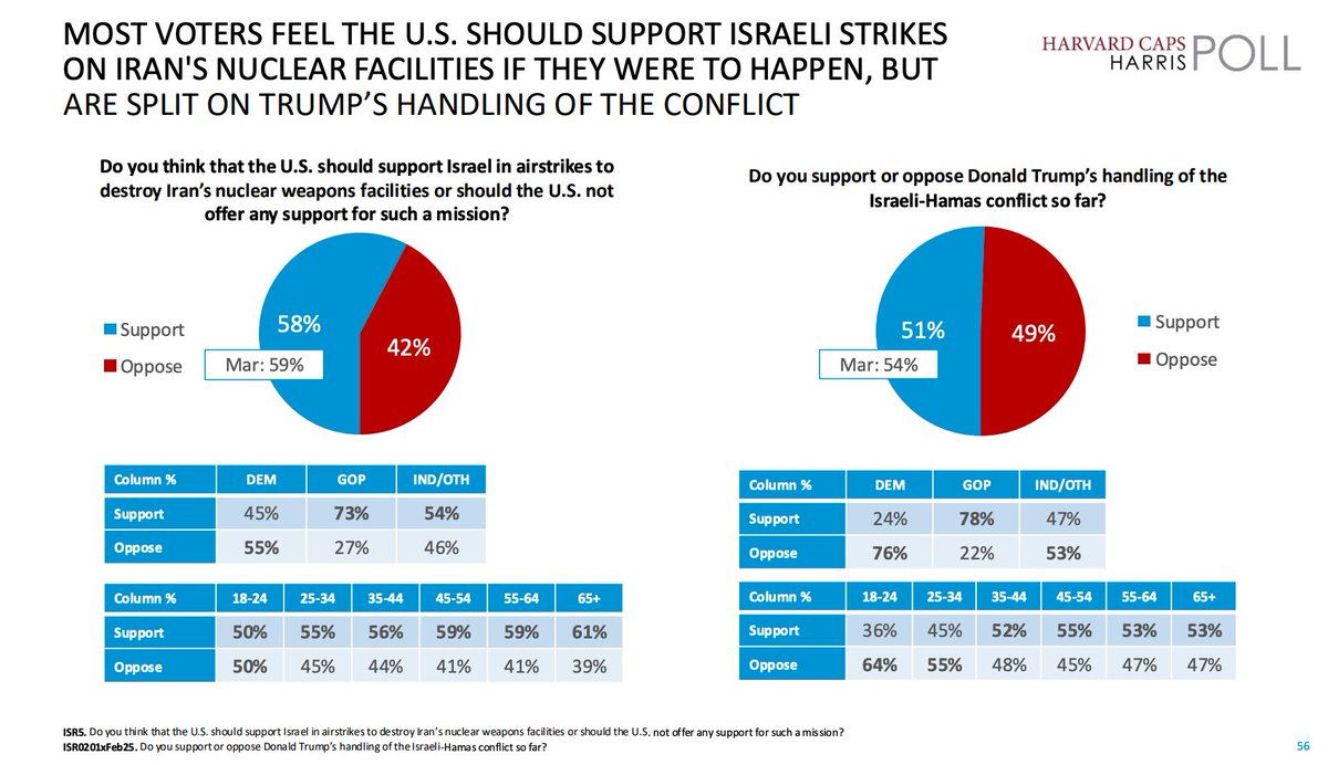 پیوست ۱. آمار اخیر هاروارد/هریس از موضع شهروندان آمریکا نسبت به حمله به تاسیسات هستهای ایران. بر اساس این نظرسنجی که در ماه آوریل انجام شده است، ۷۱درصد از پاسخگویان از نابودی تاسیسات «سلاحهای هستهای» ایران دفاع کرده اند؛ و جالب اینجاست که این حمایت در میان جمهوریخواهان ۸۰ درصد است. باید توجه کرد که با تلاشهای لابی اسرائیل و البته شخص ترامپ (که خصوصا در مصاحبه اخیرش شدیدا نمود دارد) جامعه آمریکا تفاوتی میان زیرساختهای غنیسازی و تسلیحاتی هستهای ایران قائل نیست./۲