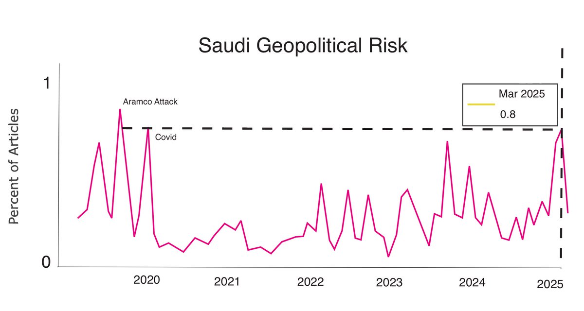 پیوست ۴. پیشتر در تحلیل چتهای لو رفته نشریه آتلانتیک در ماه مارس، همین چارت را مورد بررسی قرار دادیم. در آن زمان توجه بازارهای مالی آمریکا به جنگ در خاورمیانه وضع بهتری داشت. اگرچه در آن زمان چون آثار جنگ تعرفهای ظاهر نشده بود و طبق مدلهای بلک راک تاثیر واقعی آن بر بازارهای مالی کمتر از ماه آوریل برآورد میشد. به هر حال، علیرغم افزایش تاثیر واقعی جنگ در خاورمیانه، توجه بازارهای مالی به جنگ در خاورمیانه در ماه آوریل کمتر شده است. باید توجه داشت که بازدارندگی تابعی از حساسیت بازارهای مالی به جنگ است و واقعیت امر در مرتبه دوم است و در ادامه نشان میدهیم که این امر از عوارض منفی سفر خالد بن سلمان به تهران و سیگنالهای غلط برخی متاثر بوده است./۵ x.com/MehdiKharratya…