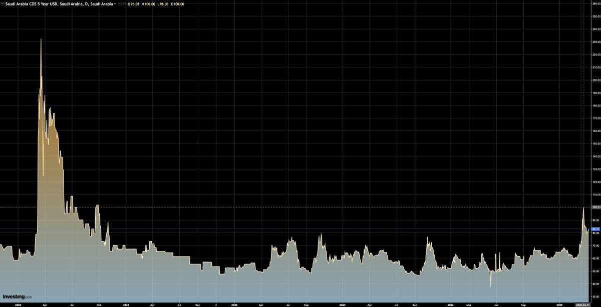 پیوست ۱۱. نمودار دیگری که نیاز سعودی به این سفر و آثار مخرب آنرا بخوبی نشان میدهد، نمودار CDS اوراق قرضه پنج ساله سعودی است که با ریسکهای ژئوپولتیک نسبت روشنی دارد. این شاخص در ۱۱ آوریل ۲۰۲۴ (۵ روز قبل از اعلام رسمی سفر خالد) به بیشترین میزان از دوران COVID و به عدد ۱۰۰ رسیده بود./۱۲