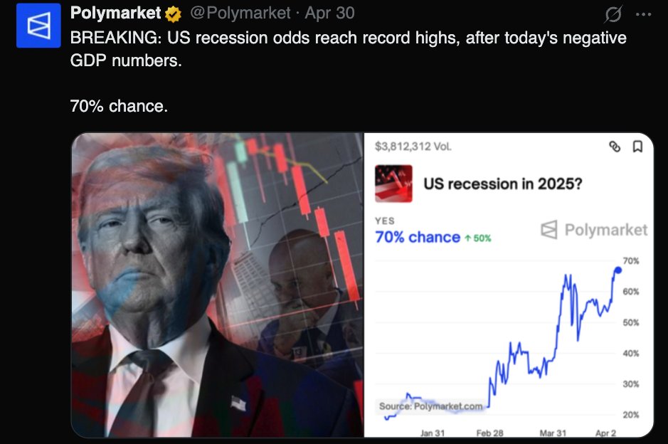 @MeetThePress پیوست ۱۶. مساله کاهش قیمت نفت برای ترامپ بسیار حیاتی است چرا که احتمال وقوع رکود در آمریکا پیروی افزایش شدید انتظارات تورمی به میزان زیادی افزایش یافته و طبق دادههای Polymarket به ۷۰ درصد رسیده است./۱۷
