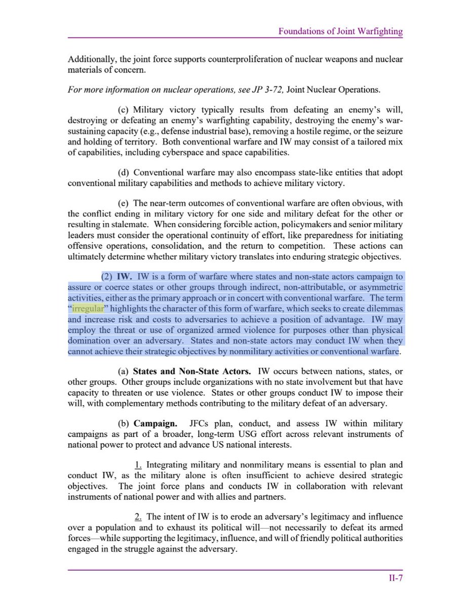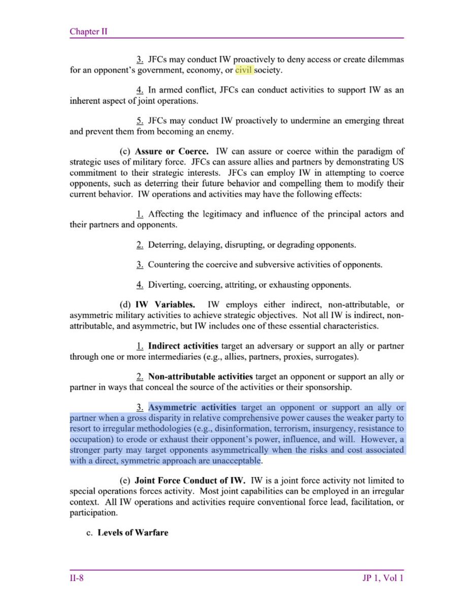پیوست ۲۰. در فراز مهمی از این سند میخوانیم: «فرماندهان نیروهای مشترک ارتش آمریکا (JFCs) ممکن است جنگ نامنظم (IW) را بهصورت پیشدستانه اجرا کنند تا دسترسی دشمن را مختل کرده یا برای دولت، اقتصاد یا جامعهٔ مدنی او چالشهایی ایجاد کنند...