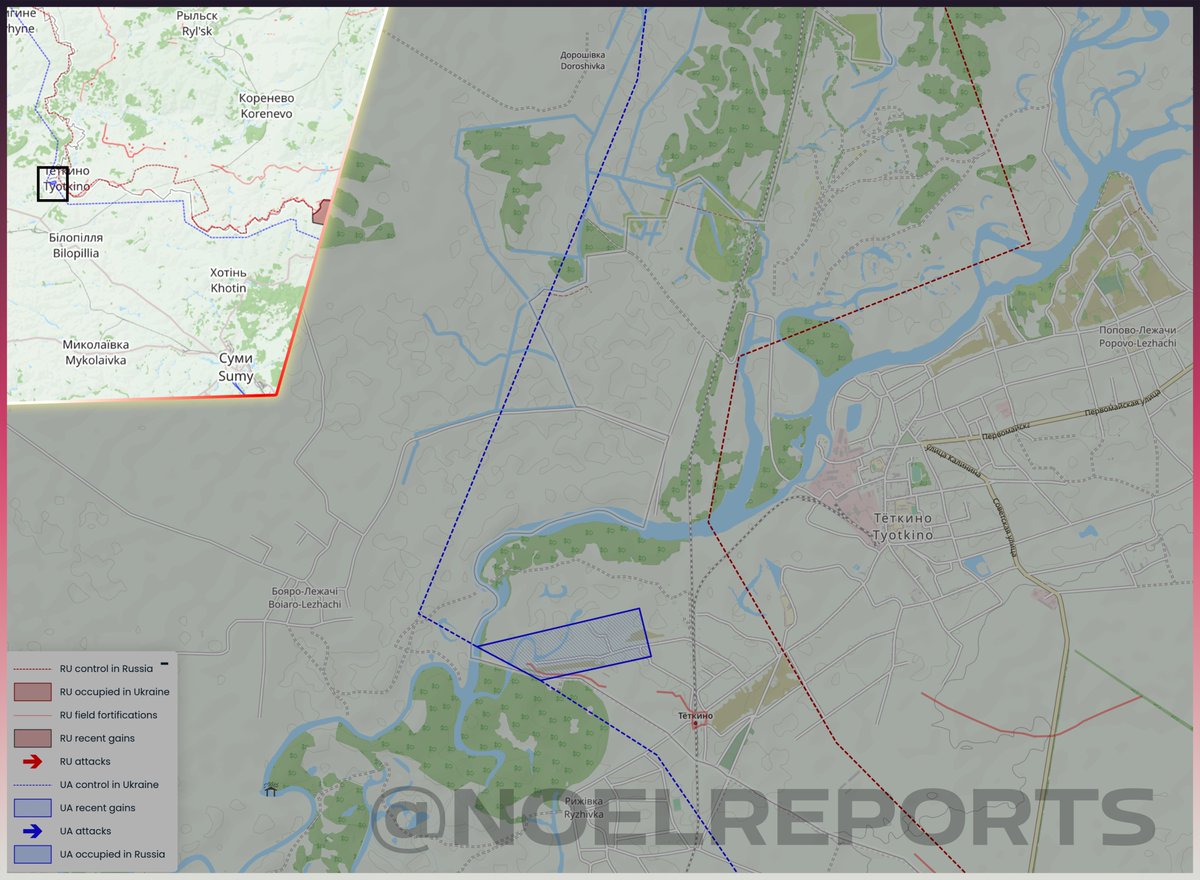 Russian sources confirmed Ukrainian troops entered the southwestern part of Tetkino, and control most of Chapyeva Street. Fightign near the railway station is ongoing. Ukraine is also attacking from different sides, aiming to encircle Tetkino.