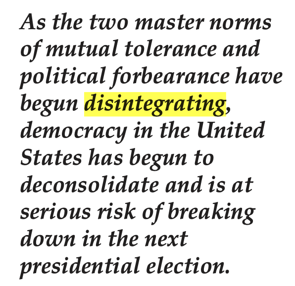"Each side comes to view the other as an existential threat, straining and then rupturing respect for democratic norms and rules."