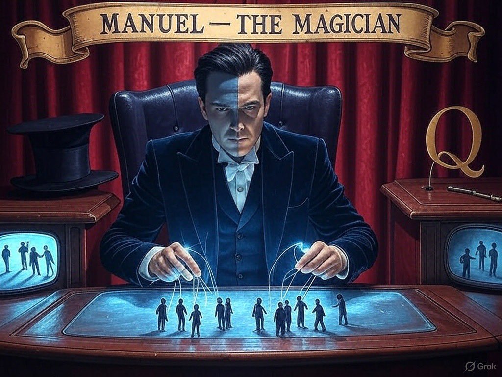 Manuel sat in his narrow, book-lined study, the glow of three monitors casting shadows across his sharp features.