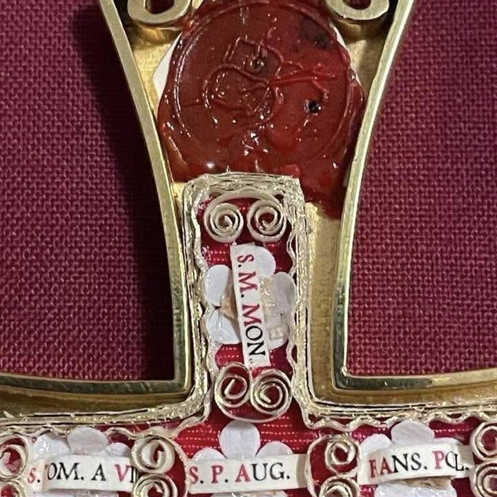 La cruz que el nuevo papa León XIV luce directamente sobre su pecho, que no es otra que la que lucía ya como cardenal, lleva incrustadas en su interior varias diminutas reliquias: una es de S. Agustín, otra de Sra. Mónica (su madre)… y una tercera del beato Anselmo Polanco, obispo mártir de Teruel, agustino como el Santo Padre, asesinado por el Ejército Republicano en Pont de Molins el 7 de febrero de 1939.