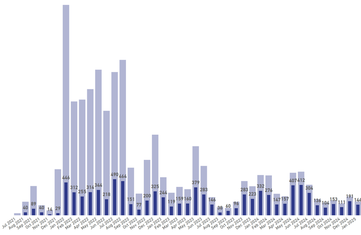 Here are the claims for Infectious and Parasitic Diseases across all Industries (in pale blue). I have highlighted the sub-totals for the Health industry (dark blue). Note while Health was a more proportionate contributor in 2021 to mid-2023, from that point on it dominates.