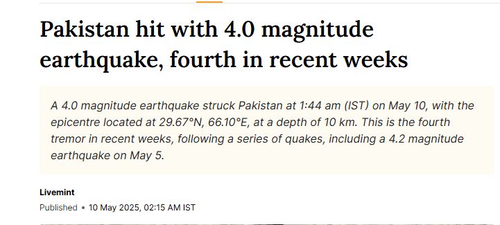 A 4.0 magnitude earthquake was recorded at 29.67°N, 66.10°E at depth of 10 KM