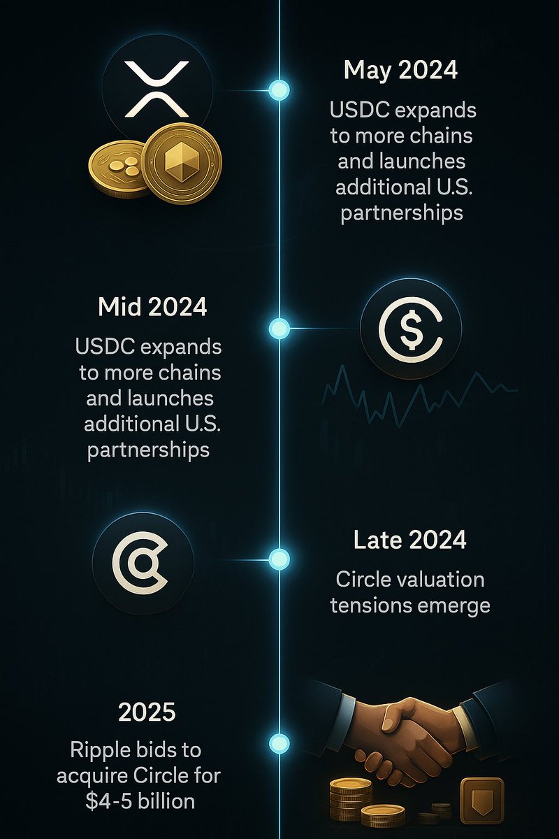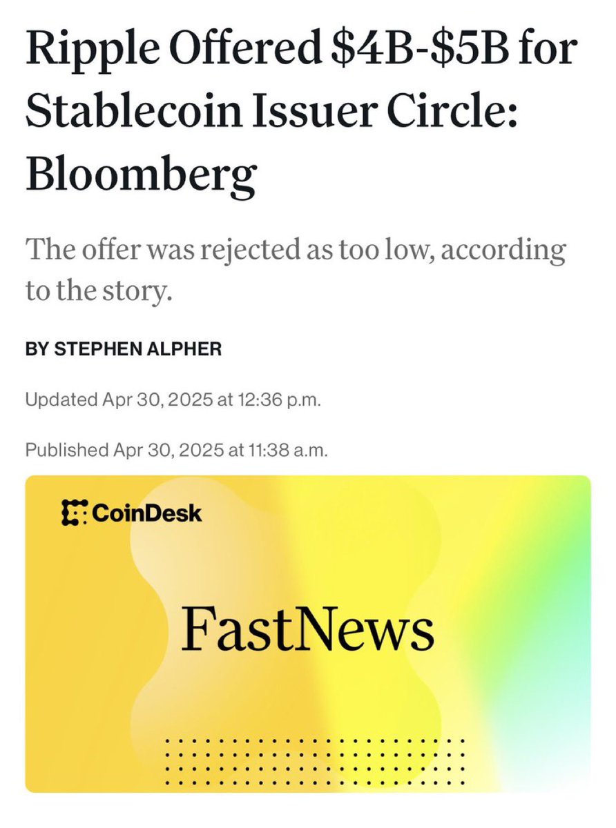(2/🧵) Ripple reportedly made a $4–5 billion offer to acquire Circle, the issuer of USDC.