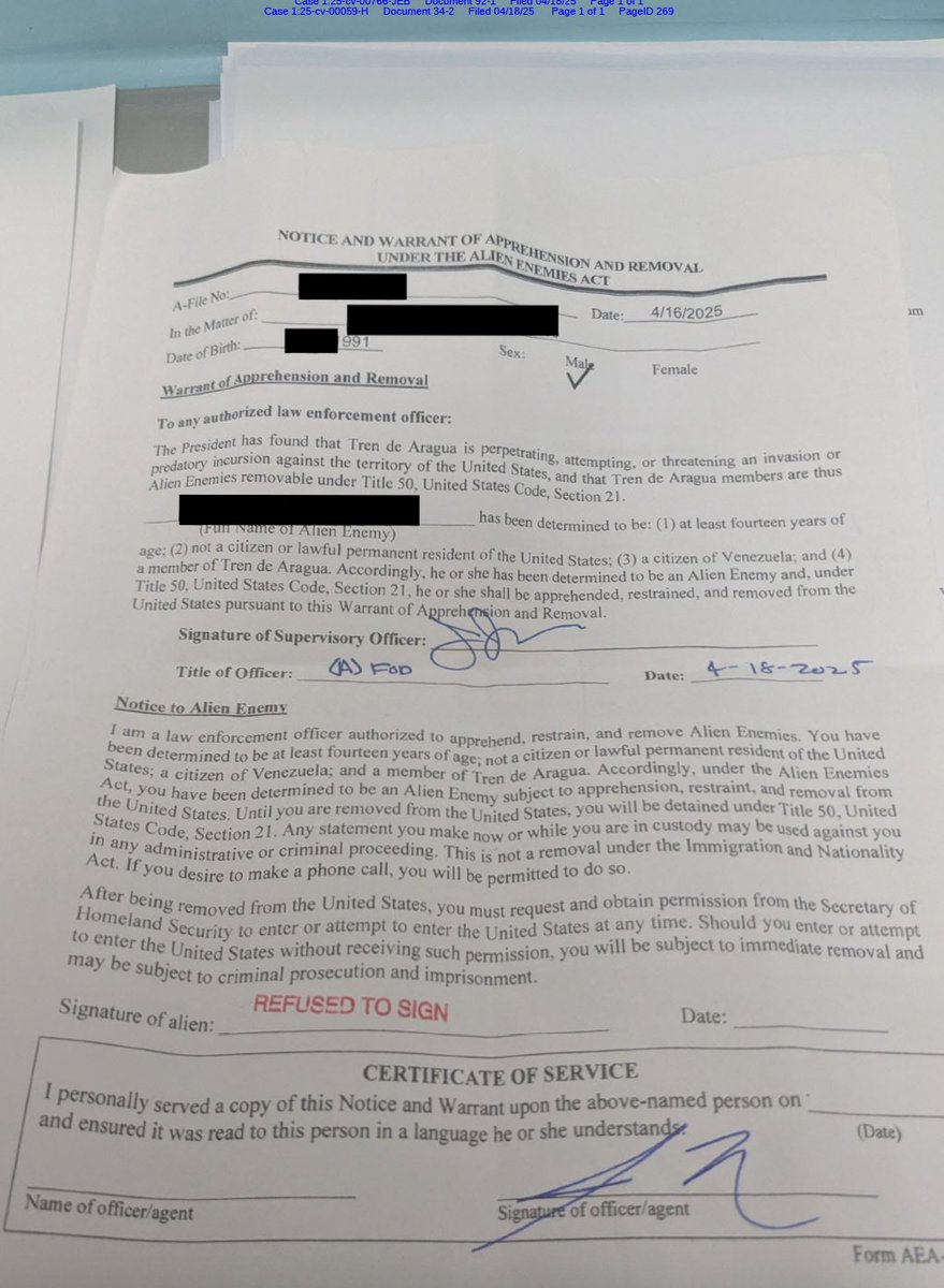 ACLU alleges that the Venezuelans are getting only 24 hrs notice, & the notices, in English, fail to advise that they have a right to challenge removal in a habeas corpus action. The NDTexas judge (Trump appointee) was slow to act on a emergency motion ...