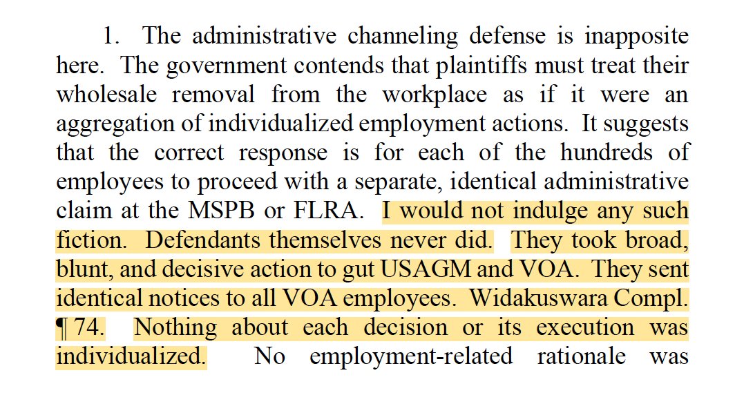 ... On appeal, 2 conservative DC Circuit judges tried to halt Lamberth’s order and relegate the plaintiffs to administrative remedies. They wrote that the dismantling of USAGM/VoA was just a “collection of ‘many individual actions' that cannot be packaged together.” ...