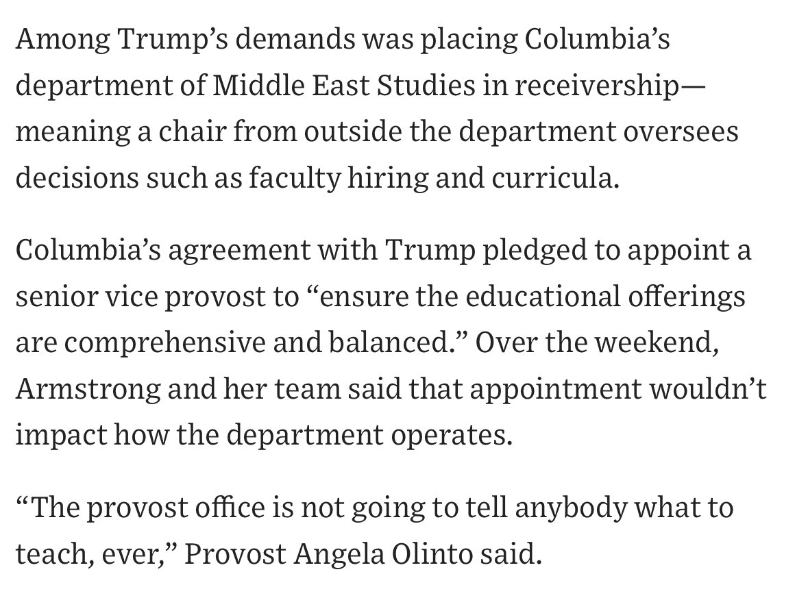 “Columbia could fight the move in court; the Justice Department would need to prove that the arrangement is warranted. But a court case could take years, and Columbia would likely lose federal funding in the interim—and might ultimately lose. Fighting the move would also open the school up to required depositions and legal fact-finding, which could keep the school’s campus politics in the spotlight.”